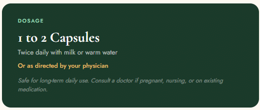 Take it with milk or warm water. This is not incidental. Milk is an Anupana in Ayurveda — a vehicle that carries herbs deeper into the tissues and amplifies their effect. Warm water does the same. Both options are recommended for a reason.