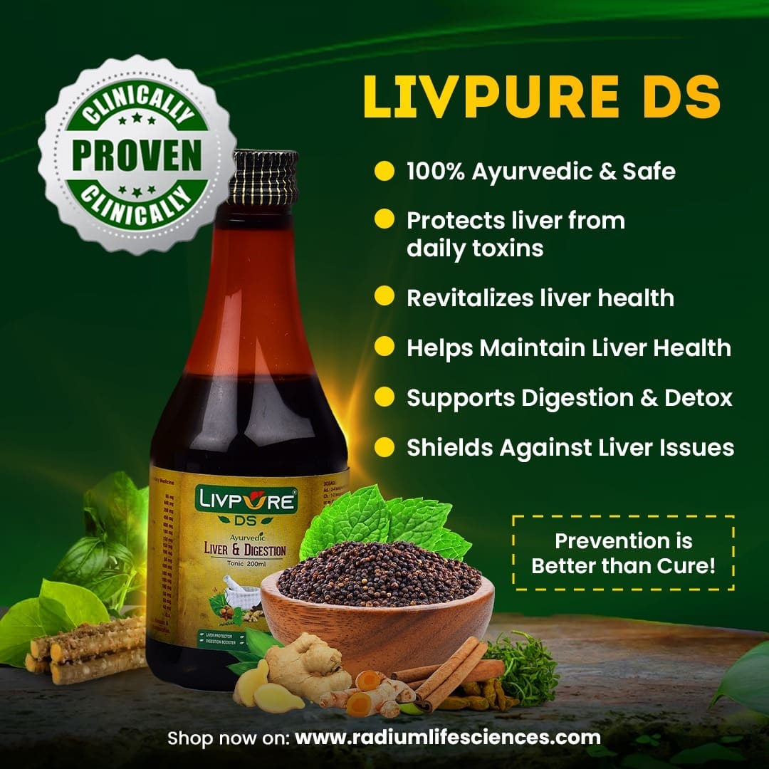Livpure DS is one of the most dependable ayurvedic liver syrups available in India for natural liver treatment. It keeps your liver healthy, robust, and active so that your entire body can flourish, supported by the purity and promise of Radium Lifesciences